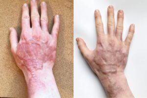 After 2,5 months (and still counting) of using the gel, I experience my scar tissues as more moist, flexible, alive, stronger and healthier. I am using a compression glove and silicone pads on my right hand, where the skin were damaged the most, and therefore needs compression to level out the skintransplantation, and I believe, that the gel is helping the scar tissue become more flexible and able to level out under the compression faster.