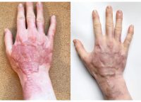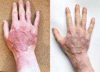 When I started to use the gel, my scar tissues were 4 months old. The scar crusts from the burns and the skintransplantation had settled and healed, and were now regenerating further. The condition of the scar tissues at this point were that they were sensitive, beginning to raise, getting harder, tenser and stiffer.